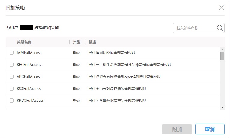 4. 选择相应的系统或者自定义策略,点击“附加”按钮,将相应的策略授权到该用户。