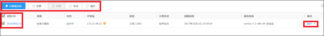 购买完之后机进入控制台查看购买的实例,包括云物理主机状态、云物理主机的公网和内网IP以及生命周期等。