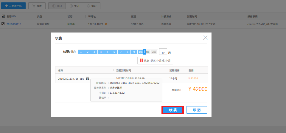 在续费选择弹窗,划动滑块选择续费的时长,鼠标悬停在名称上,可以看到服务器ID,服务器类型,主机IP,弹性IP,确认信息后点击续费。
