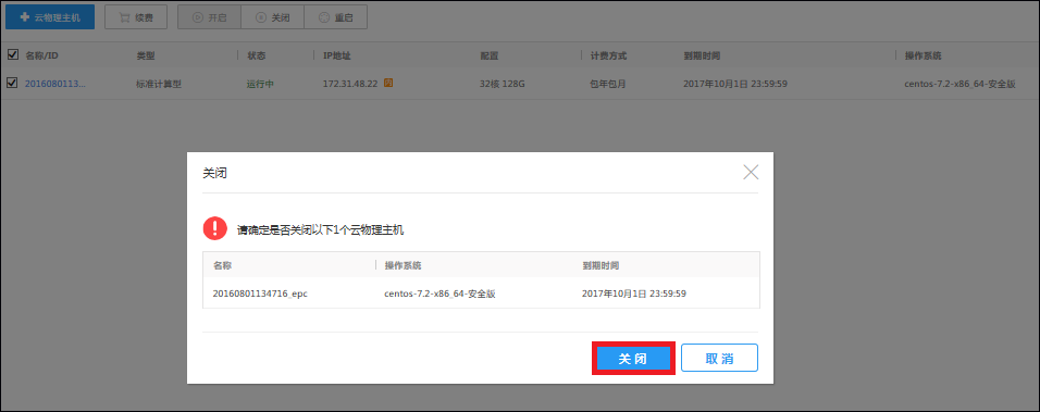 进入控制台主机列表页面。选中一台或多台状态为“运行中”的云物理主机,在菜单栏中点击“关闭”,进入关闭对话框,点击“确认”按钮,即可关闭云物理主机。 重启:用户可以在控制台对云物理主机进行重启。首先找到正在运行需要重启的云物理主机,在菜单栏中点击“重启”,进入重启对话框,点击“确认”按钮,即可重启云物理主机。