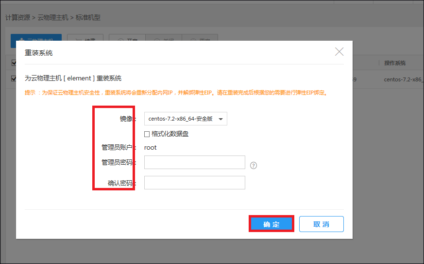 选中要重装系统的主机,确定该主机为“关机”状态,然后点击重装系统按钮。填写要更改的系统镜像名称和管理员密码描述,点击确定即可创建重装系统:输入系统镜像名称和管理员密码之后,点击确定按钮,即可生成新的主机系统,此时页面即跳转到物理云主机管理页面重装,重装网络资源会回收并再次为保证云物理主机安全性,重装系统将会重新分配内网IP,并解绑弹性EIP。请在重装完成后根据您的需要进行弹性EIP绑定。
