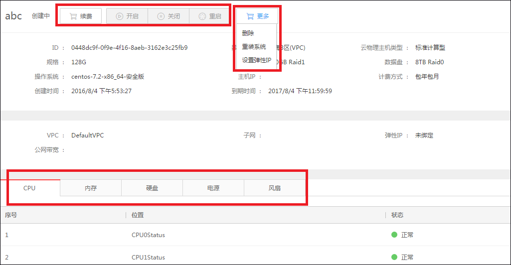 在详情页您也可以根据你主机当前的状况进行相应的续费,开启,关闭,重启,删除,重装系统,设置弹性IP等操作。