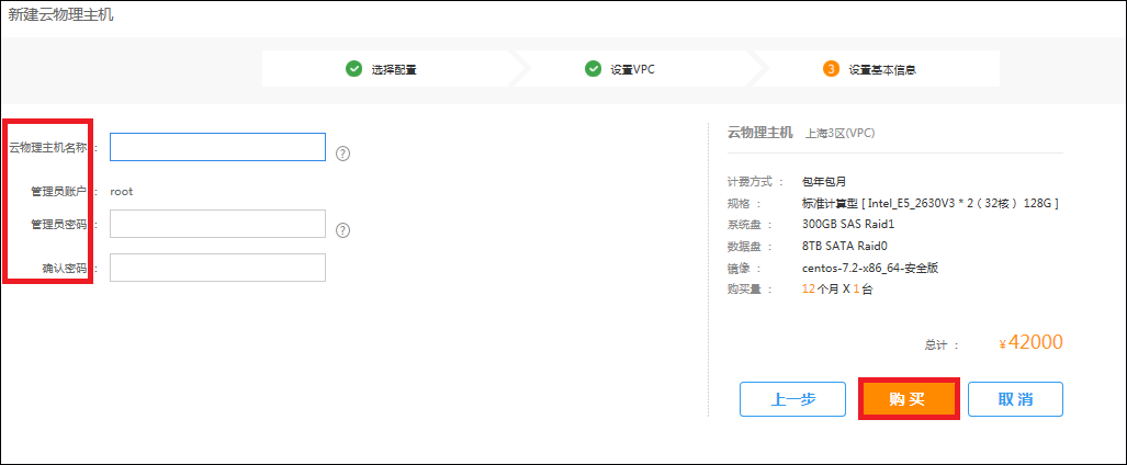 点击下一步进入确认购买页面,输入云物理主机的名称并设置管理员密码并确认: