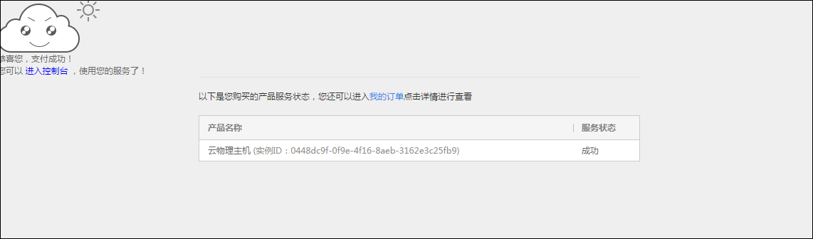 提交订单后确认支付,可看到您购买产品的服务状态,用户可选择直接进入控制台,或者点击蓝色字体“我的订单”进如你的订单列表查看你所有订单状况。