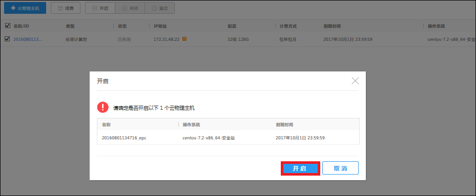 进入控制台主机列表页面。选中一台或多台状态为“已关闭”的云物理主机,在菜单栏中点击“开启”,进入开启对话框,点击“确认”按钮,即可开启云物理主机。