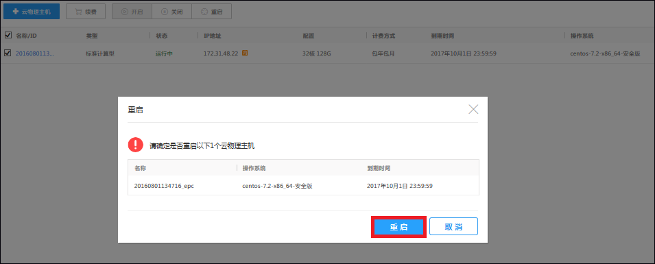 用户可以在控制台对云物理主机进行重启。首先找到正在运行需要重启的云物理主机,在菜单栏中点击“重启”,进入重启对话框,点击“确认”按钮,即可重启云物理主机