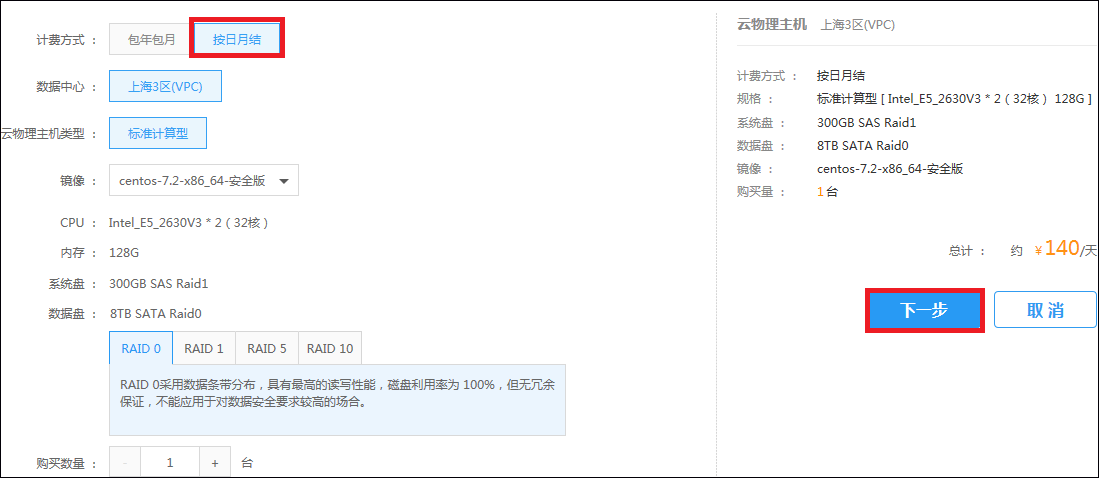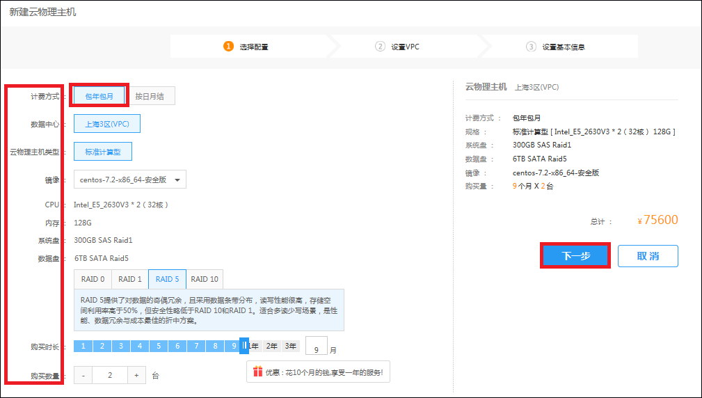 在弹出页面中,选择计费方式、数据中心、云物理主机类型、镜像、数据盘RAID类型、购买时长、数量: