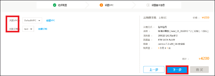选择好后点击下一步,配置虚拟专有网络。专有网络( Virtual Private Cloud ),帮助您基于云物理主机构建出一个隔离的网络环境。您可以完全掌控自己的虚拟网络,此外您也可以通过专线/ VPN 等连接方式将 VPC 与传统数据中心组成一个按需定制的网络环境,实现应用的平滑迁移上云。为保证用户资源安全性,云物理主机必须选择虚拟专有网络才可以进行创建,选择创建VPC、创建子网,则调用VPC相关的接口。