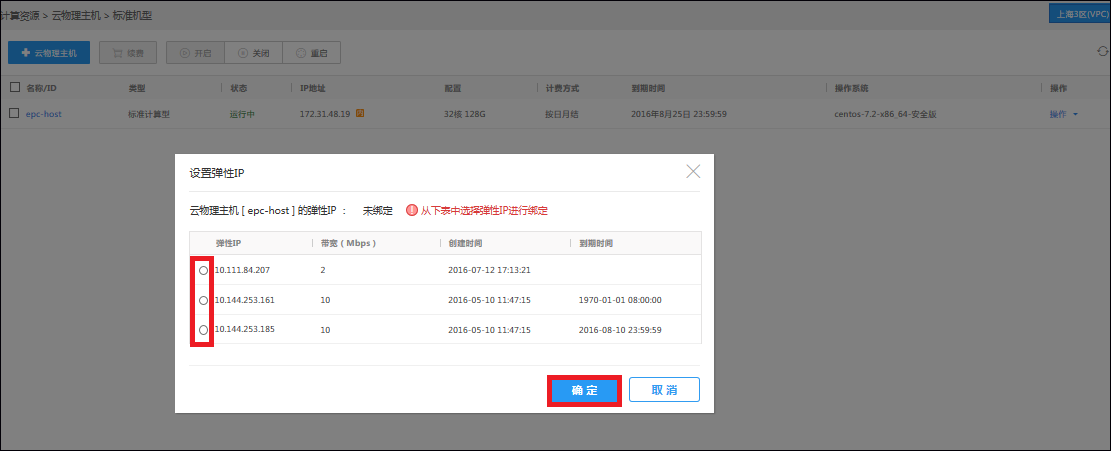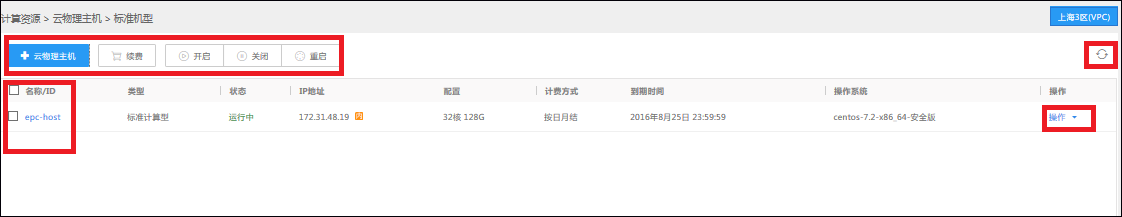 购买完之后机进入控制台查看购买的实例,包括云物理主机状态、云物理主机的公网和内网IP以及生命周期等。