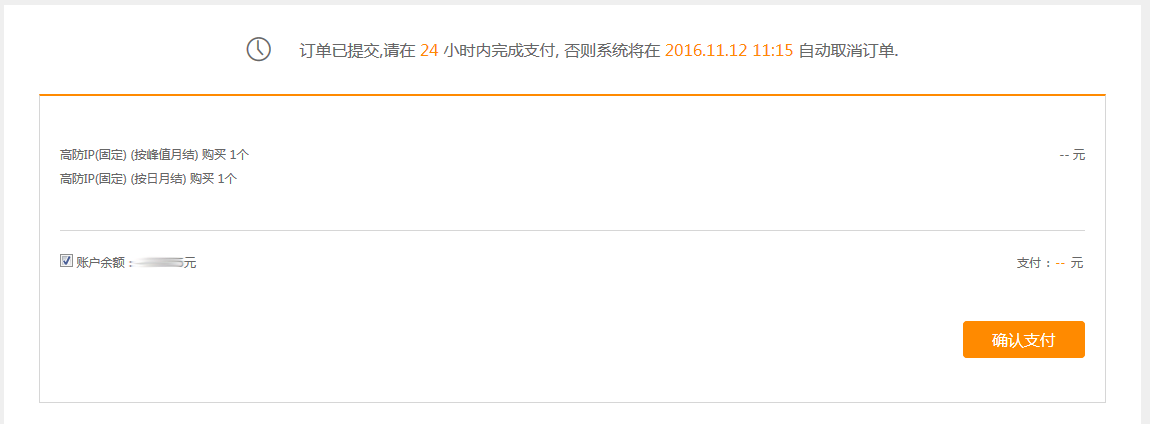 点击购买后,进入确认订单页面,此处显示的是高防的单天价格;