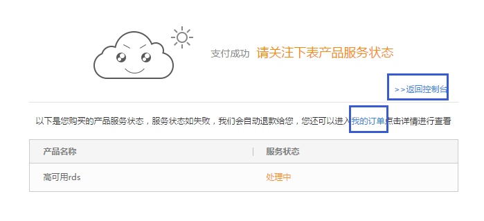 支付成功后,出现购买成功提示,点击‘控制台’可查看操作购买内容,点击‘订单列表’可进入订单管理页面。