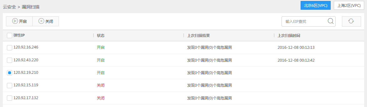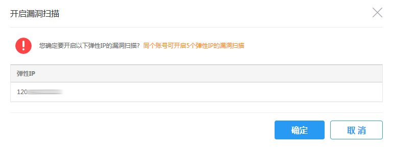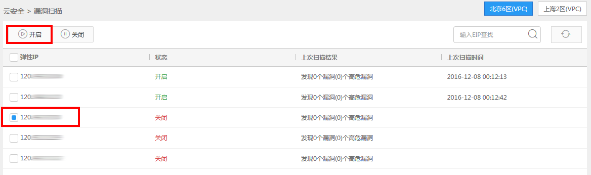 注意:同个账号下只可同时开启5个弹性IP的漏洞扫描;