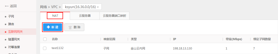 1. 点击VPC列表“互联网网关”按钮,进入NAT管理页面。