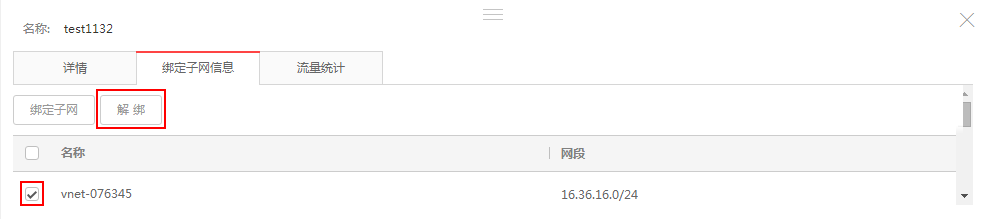 1. 勾选需要解绑的子网,点击“解绑”按钮,弹出确认解绑子网浮层。